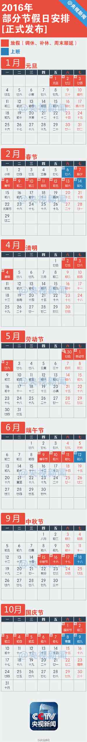 經(jīng)國務院批準,現(xiàn)將2016年元旦、春節(jié)、清明節(jié)、勞動節(jié)、端午節(jié)、中秋節(jié)和國慶節(jié)放假調(diào)休日期的具體安排通知如下。